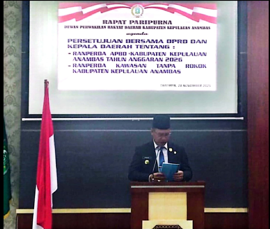 ANAMBAS, Anambaspos.co.id – Bupati Kepulauan Anambas, Aneng, menyampaikan pendapat akhir pemerintah daerah terhadap Ranperda APBD 2026 dengan menyoroti sejumlah tantangan fiskal yang masih dihadapi daerah.