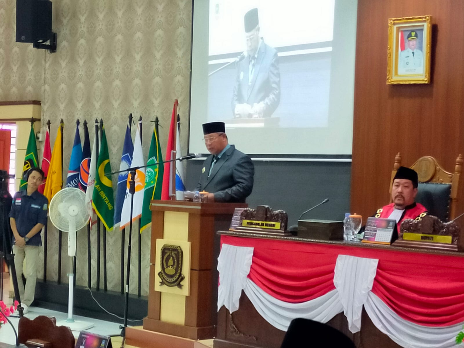Di atas mimbar, Bupati Kepulauan Anambas mengucapkan selamat kepada Pimpinan DPRD masa jabatan 2024-2029 yang baru saja dilantik.
