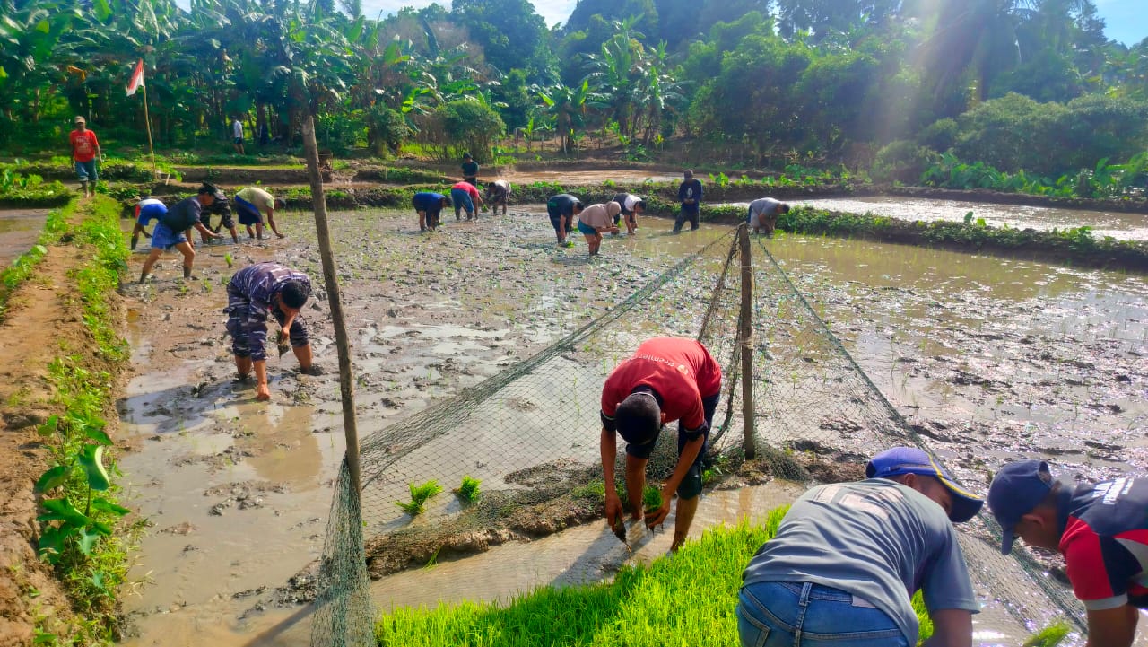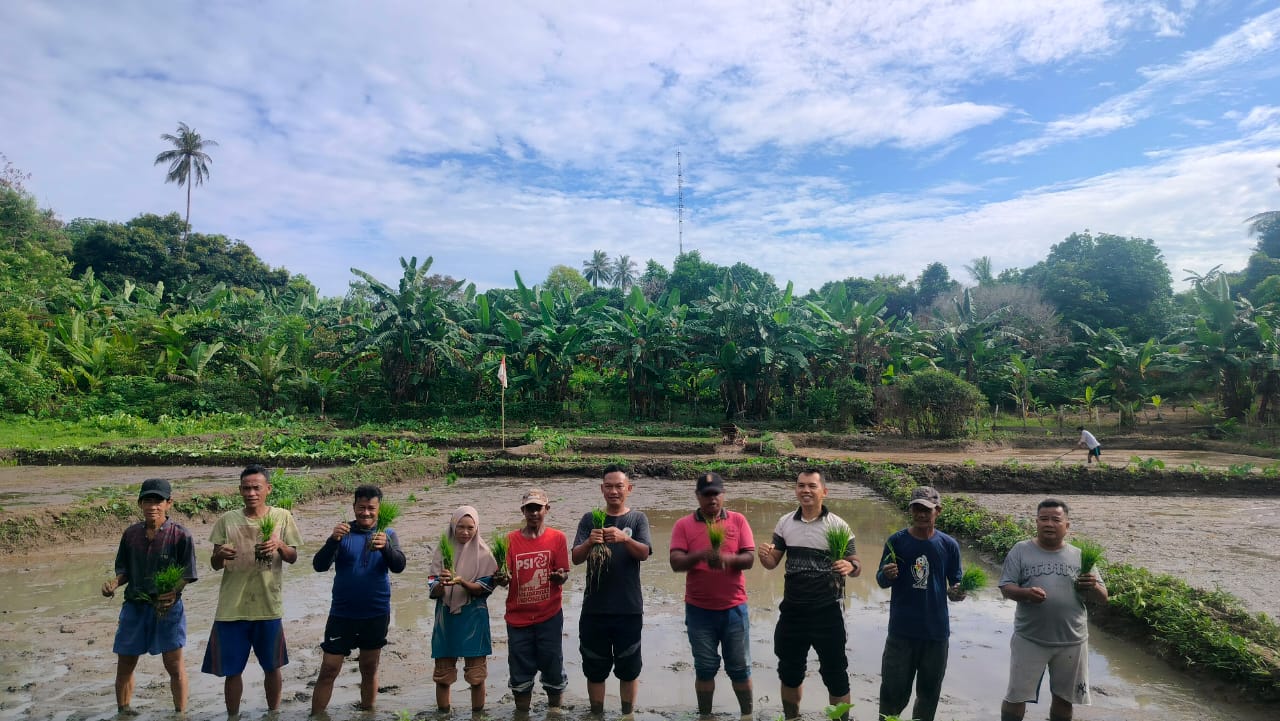Kades Rewak (kaos hitam tengah) saat menanam padi secara massal bersama dua kelompok tani di lahan persawahan seluas 2 hektar, Sabtu (31/05/2025).