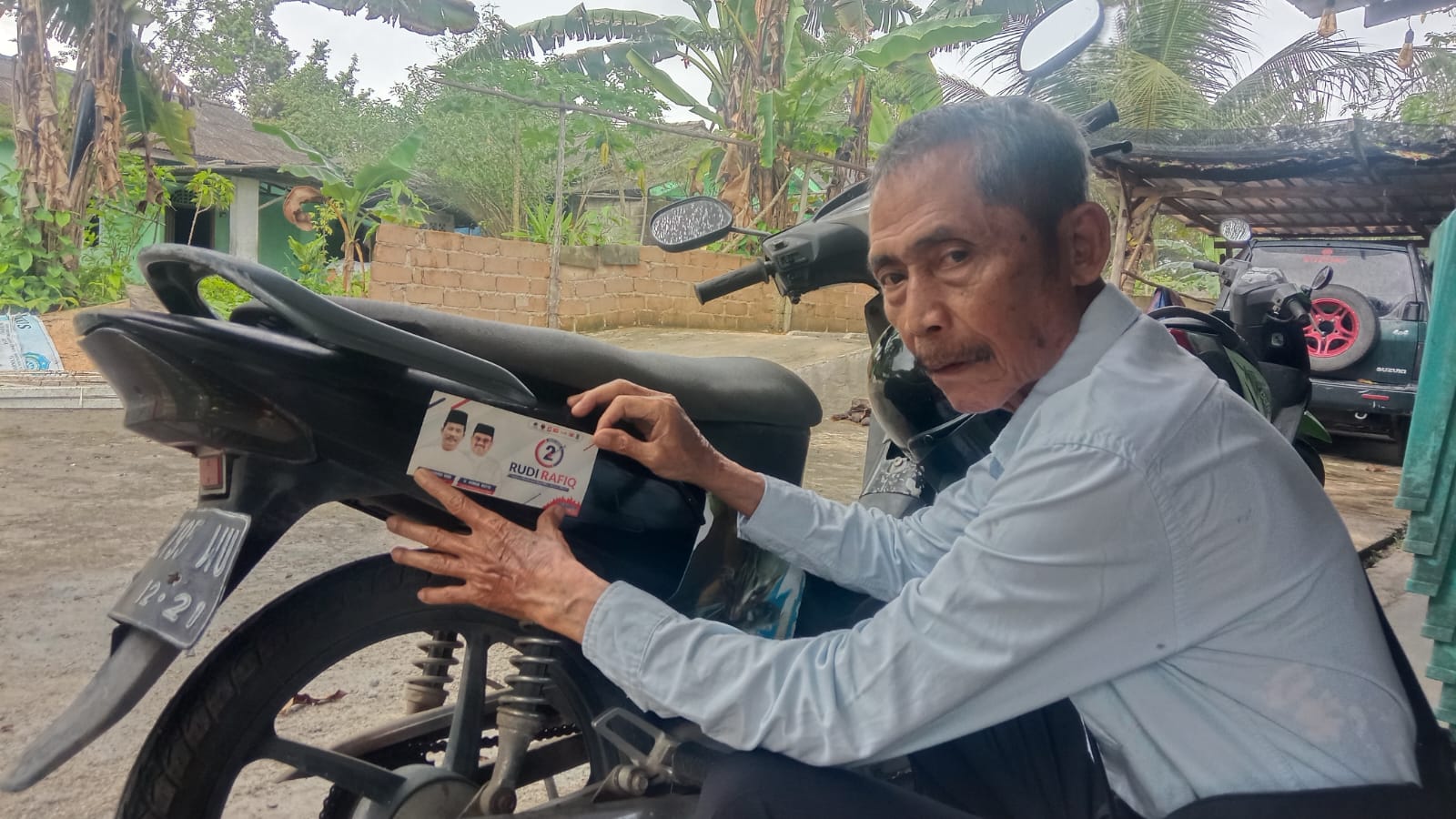 Amarudin, salah seorang warga Tanjungpinang yang sedang menempelkan stiker Paslon Rudi-Rariq saat akan mengikuti kampanye Calon Gub-Wagub Kepri, Sabtu (12/10/2024).