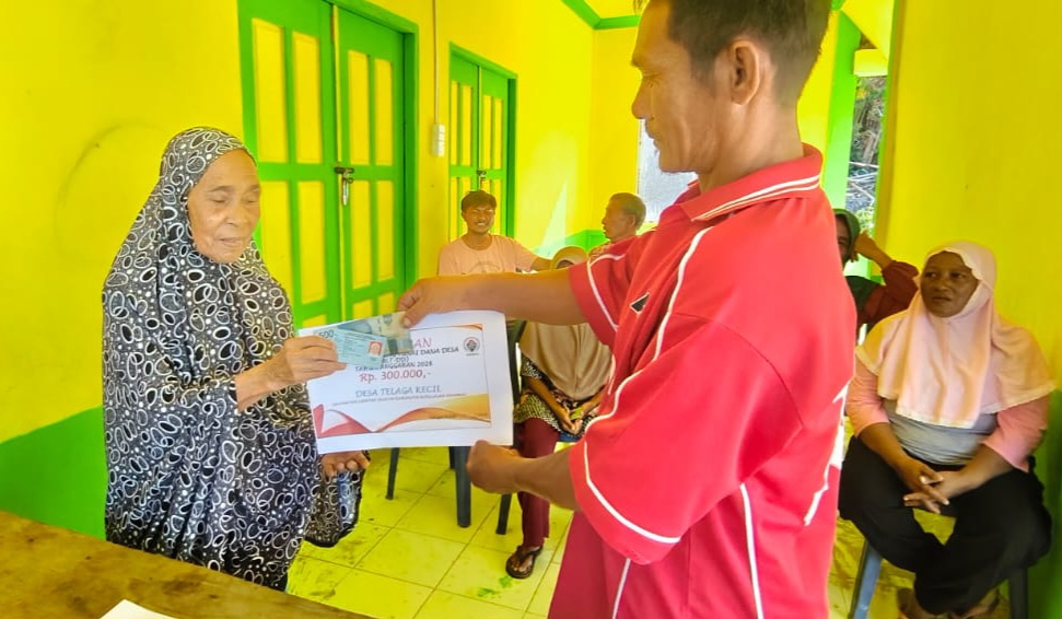 Penyaluran bantuan tersebut berlangsung di Balai Desa Telaga Kecil dan diberikan kepada 9 Keluarga Penerima Manfaat (KPM).