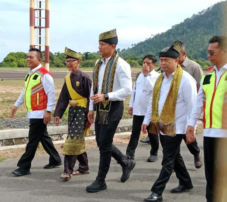 Gubernur Kepri dan Bupati Kepulauan Anambas ketika menyambut kedatangan Menko Infrabangwil dan Menhub di Bandara Letung.