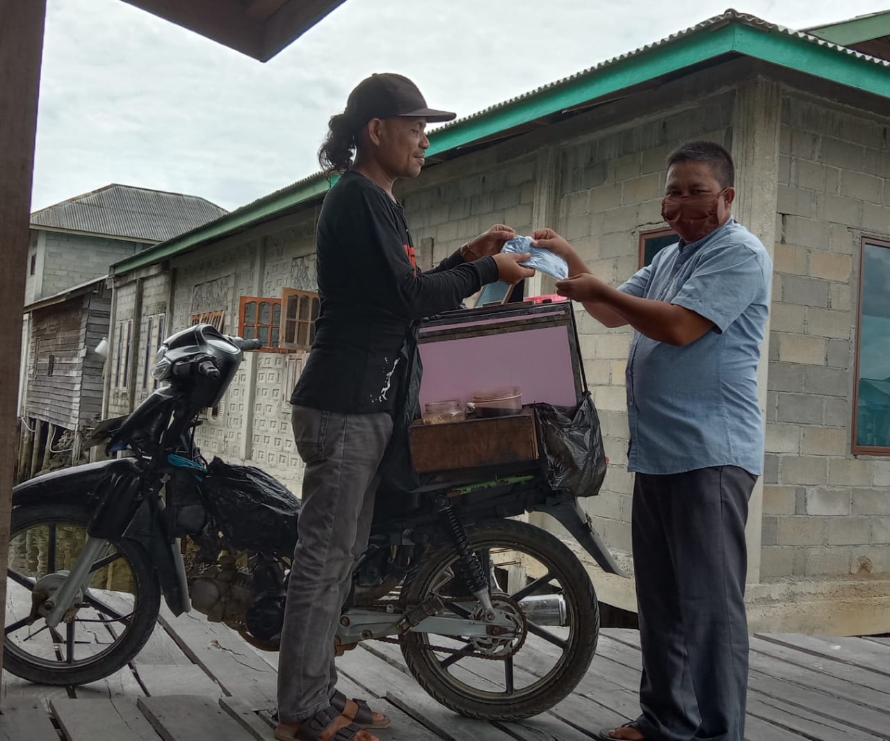 JEMAJA, AnambasPos.com – Badri, Kepala Desa (Kades) Air Biru, Kecamatan Jemaja, memberikan masker kepada seorang pedagang es keliling, di Kelurahan Letung, Sabtu (18/04/2020). Aksi peduli Bandri itu, untuk mengantisipasi dan mencegah terjadinya penyebaran Corona Virus Disease (Covid-19) di Wilayah Kecamatan Jemaja, Kabupaten Kepulauan Anambas (KKA) yang saat ini tengah giat dilakukan