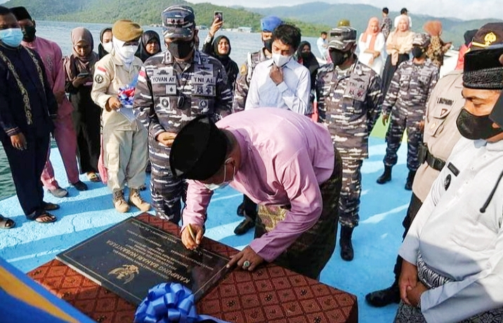 Bupati Kepulauan Anambas, Abdul Haris ketika sedang membubuhkan tanda tangan di atas batu prasasti saat meresmikan Desa Batu Belah sebagai Kampung Bahari Nusantara