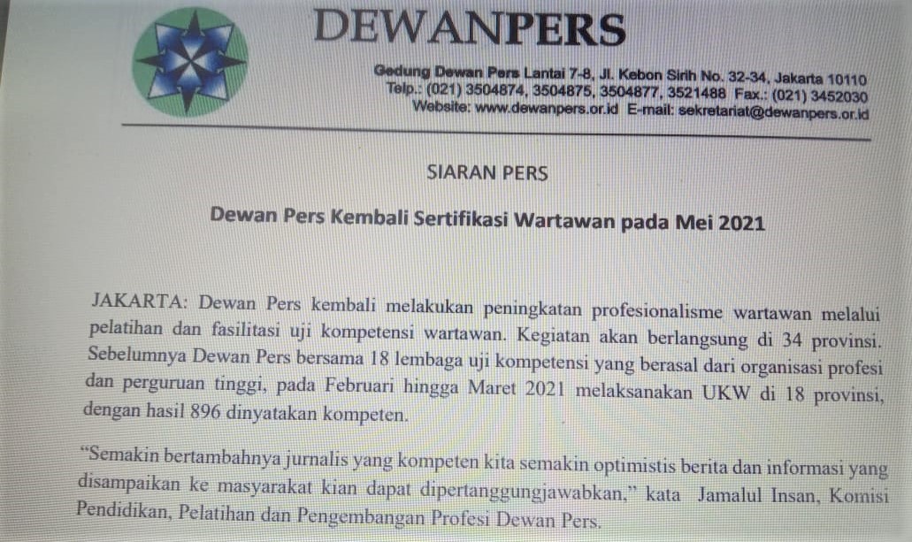 “Semakin bertambahnya jurnalis yang kompeten kita semakin optimistis berita dan informasi yang disampaikan ke masyarakat kian dapat dipertanggungjawabkan,” kata Jamalul Insan, Komisi Pendidikan, Pelatihan dan Pengembangan Profesi Dewan Pers mengacu pada Siaran Pers Resmi, Dewan Pers yang disampaikan ke Publik, pada Senin (20/04/2021) di Jakarta dan ditandatangani langsung oleh Ketua Dewan Pers, Muhammad Nuh.